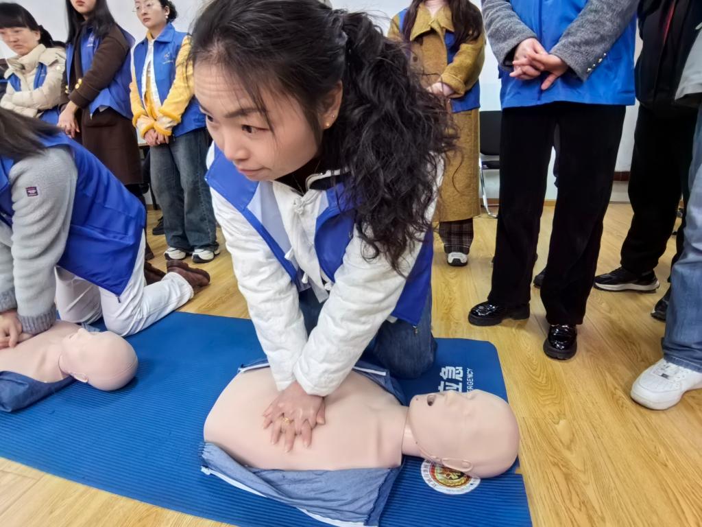 在摆满急救教具的教室里,刘胡梅第三次跪地实施胸外按压,额头细密的汗珠折射着农村转移劳动者的倔强。“保持节奏!按压深度5~6厘米,吹气时长约1秒!”教练林久捷的指导声中,电子监测仪亮起代表成功的绿灯。“我想取得红十字救护证,让我从被帮扶者变成生命的守护者。”她擦拭着模拟人脸上的汗渍,眼神愈发坚定。退役军人唐彬的感慨在训练场回荡:“战场救人是军人的天职,守护生命是公民的担当。”
