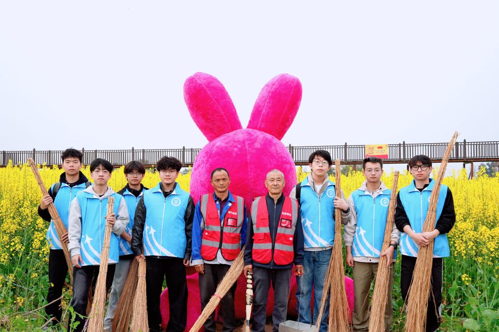 活动期间,志愿者们充分发挥年轻人的创意与活力,积极投身油菜花节的宣传推广工作。他们穿上汉服,穿梭于金黄的花海之间,不仅协助当地工作人员拍摄宣传素材,还通过自媒体平台实时分享花海盛况,吸引更多网友前来打卡。随着赏花游客数量的激增,观景点的秩序维护压力随之增大。面对络绎不绝的人流,学生志愿者们迅速转换角色,化身“秩序守护者”。他们在景区入口、观光步道、热门拍照点等关键区域,耐心引导游客有序通行,提醒大家注意安全,避免拥挤。