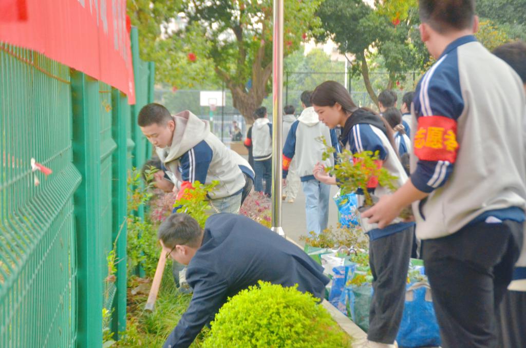 上午9时,师生们在敬业楼前集合准备。大家分工协作、默契配合,挖坑、扶苗、培土、浇灌,干劲十足。老师们一边劳作,一边向学生传授栽种技巧,同学们主动承担花苗搬运、浇水等工作。经过近两小时努力,四百余株蔷薇花苗整齐挺立在春风中。