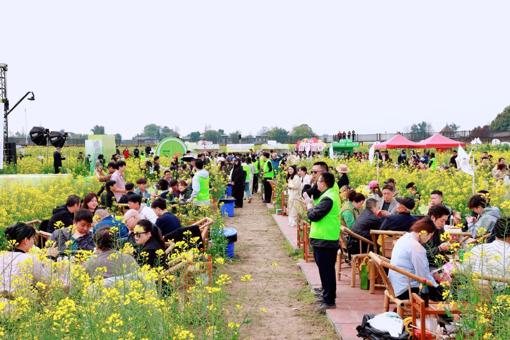活动当天,高坪菜花公园内春意盎然,金黄的花海中整齐排列着数十桌火锅宴席,百余名市民游客围炉而坐,在融融春光中共享地道川味美食。为保障活动安全有序进行,学院青年志愿者分为多个小组,分别驻守在入口引导区、就餐服务区等关键点位。在入口处,志愿者们耐心引导游客有序入场、协助扫码登记,维护排队秩序;在就餐区,他们穿梭于席间,及时疏导人流,提醒游客文明用餐、注意安全,并主动帮助解决现场各类临时需求,用细致周到的服务为春日盛会增添了一抹亮丽的“志愿蓝”。