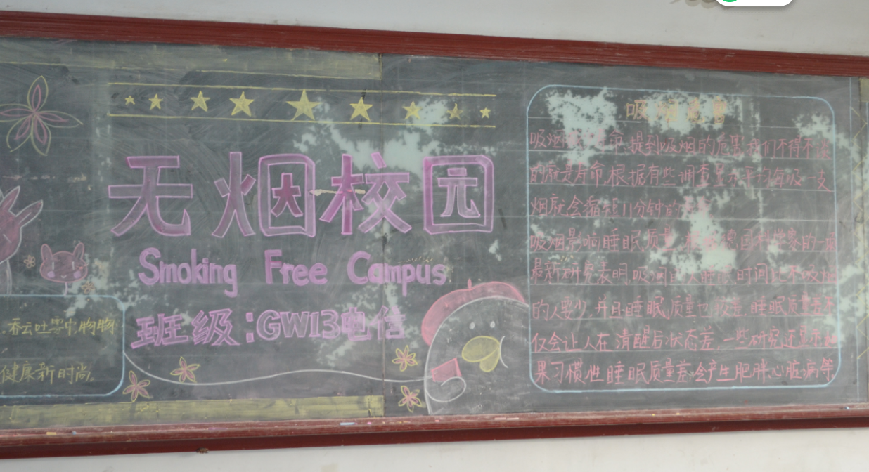 自禁烟活动开展以来,基础部全体老师、学生认真筹备,积极参与。一是宣传动员阶段,首先召开辅导员专题会议,布置禁烟活动各项工作,要求大家思想上高度重视,认真落实;其次各班召开主题班会,宣讲“吸烟有害健康”的相关知识,要求学生通过办黑板报、手抄报,积极参与禁烟宣传活动中来;三是组织辅导员、学生干部队伍,不定期进行巡查监督,对在校园抽烟的现象进行干涉。