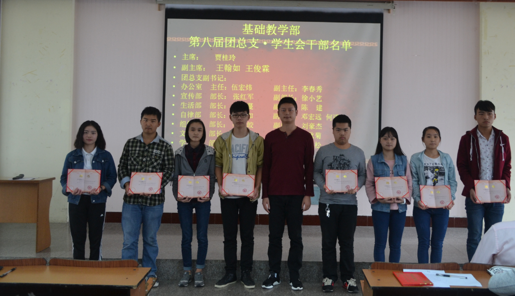 10月12日,基础教学部第八届团总支、学生会换届选举大会在南阶梯教室隆重召开。大会在庄严的共青团团歌中拉开序幕,基础部团总支书记陈水松老师宣读了新一届团总支、学生会干部的聘任名单,主任助理刘琪老师为同学颁发了聘书,并对同学们提出来要求和希望,希望新一届的学生干部本着为老师和同学们服务的态度,发扬不怕累、不怕苦的优良作风,认真学习、努力工作,在新的岗位上做出新的贡献。